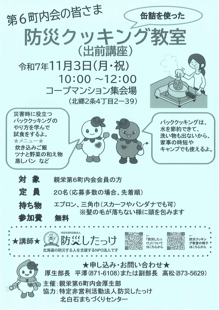 2025年10月8日 / 最終更新日 : 2025年10月8日 shinei-jimu 親栄第6町内会 第六町内会の防災クッキング教室 11月3日(月・祝)に防災クッキング教室が開催されます。詳細は下のチラシを見て下さい。宜しくお願いいたします 共有:クリックして Twitter で共有 (新しいウィンドウで開きます)Facebook で共有するにはクリックしてください (新しいウィンドウで開きます) 関連 FacebooktwitterHatenaPocket