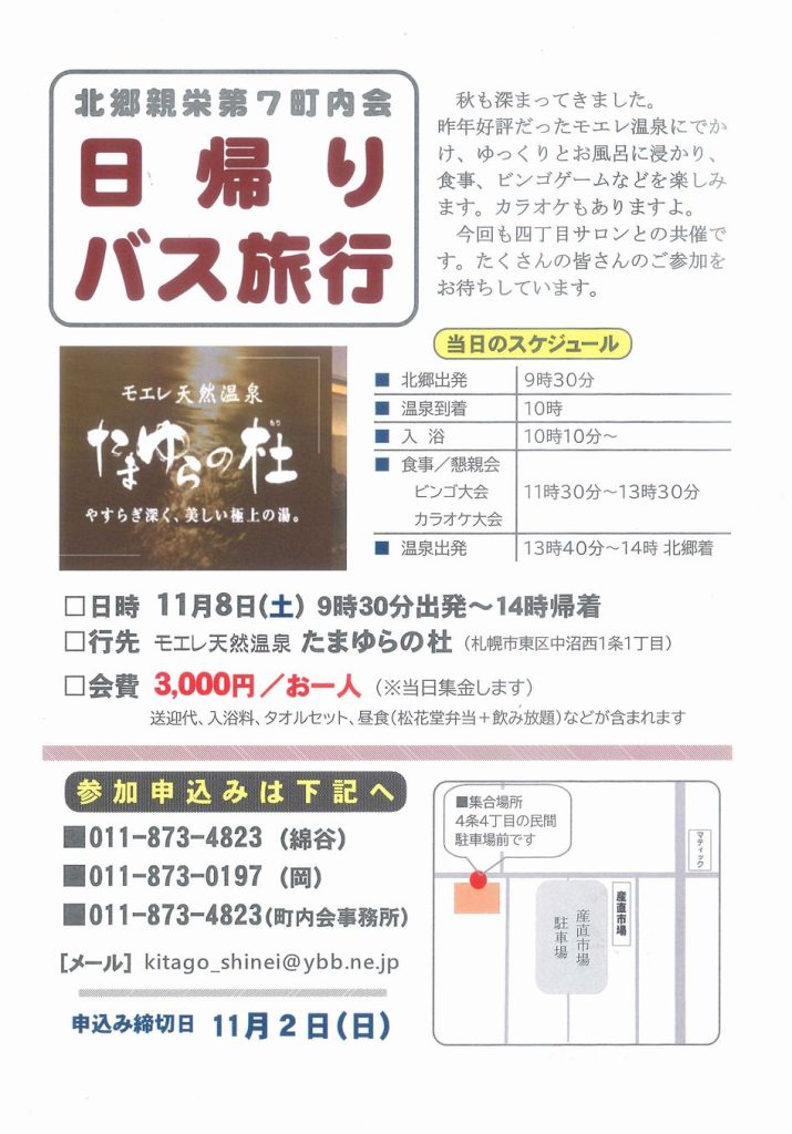 3年連続で「モエレ天然温泉たまゆらの湯」に出かけます。10種類の様々な湯舟でゆっくり温泉に浸かったあとは食事(松花堂弁当)をしながら懇親会で楽しみます。物価高の影響で会費は500円値上げしましたが、今年はドリンク飲み放題プランにしました。