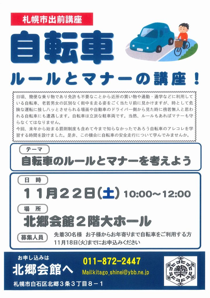 2025年10月23日 / 最終更新日 : 2025年10月23日 shinei-jimu お知らせ 自転車のルールとマナーの講座 来年度から始まる自転車運転者への罰則のことから日頃の自転車利用に関してのルールとマナーの札幌市の出前講座を催します。是非、ご参加ください。 共有:クリックして Twitter で共有 (新しいウィンドウで開きます)Facebook で共有するにはクリックしてください (新しいウィンドウで開きます) 関連 FacebooktwitterHatenaPocket