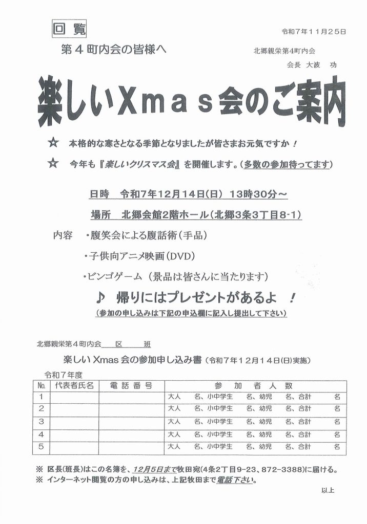 2025年11月25日 / 最終更新日 : 2025年11月25日 shinei-jimu 親栄第4町内会 第四町内会のクリスマス会のお知らせ 下記要領でクリスマス会を行いますご希望の方はお申込みください 共有:クリックして Twitter で共有 (新しいウィンドウで開きます)Facebook で共有するにはクリックしてください (新しいウィンドウで開きます) 関連 FacebooktwitterHatenaPocket