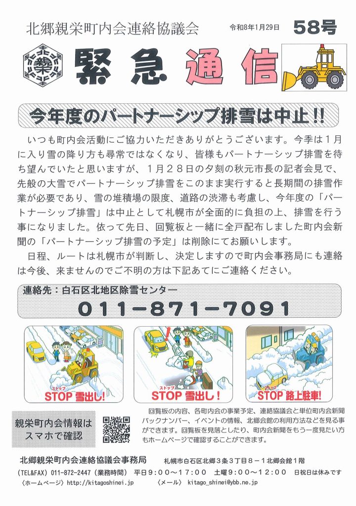 2026年1月29日 / 最終更新日 : 2026年1月29日 shinei-jimu 情報 事務局より緊急通信 1月28日に札幌市より今回の大雪によりパートナーシップ排雪を中止する旨の発表がありました。今後、札幌市が幹線道路と生活道路の排雪をする予定です。 共有:クリックして Twitter で共有 (新しいウィンドウで開きます)Facebook で共有するにはクリックしてください (新しいウィンドウで開きます) 関連 FacebooktwitterHatenaPocket
