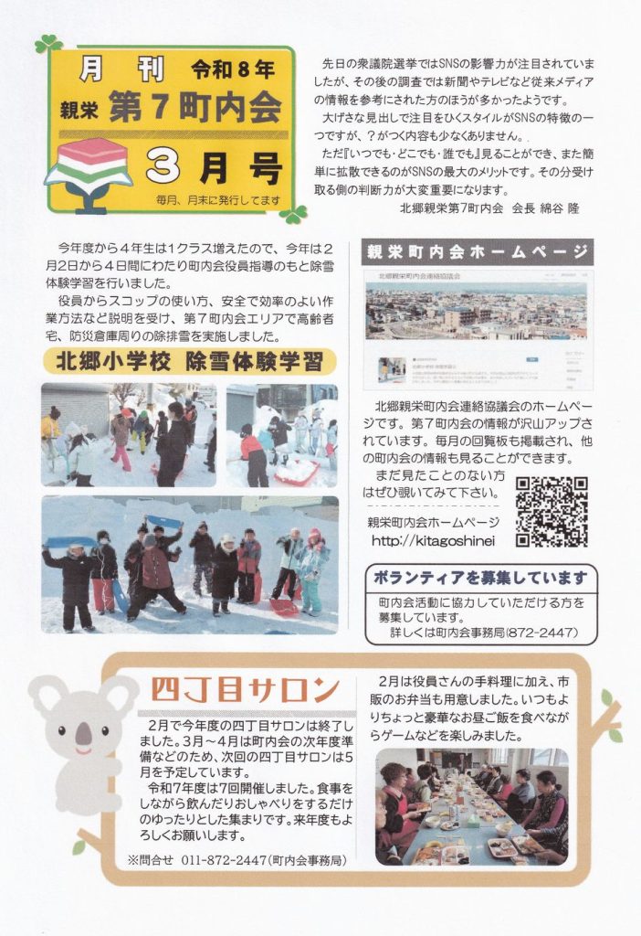2026年2月22日 / 最終更新日 : 2026年2月22日 takashi wataya 親栄第7町内会 月刊第7町内会 3月号 大雪が降り、衆議院選挙があって、イタリアでは冬期オリンピック、そして生活道路は暖気でぐちゃぐちゃ~札幌市の緊急排雪作業はどうなってる? という令和8年の2月末です。 共有:クリックして Twitter で共有 (新しいウィンドウで開きます)Facebook で共有するにはクリックしてください (新しいウィンドウで開きます) 関連 FacebooktwitterHatenaPocket