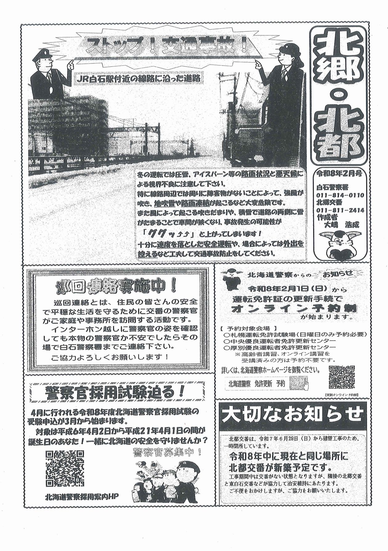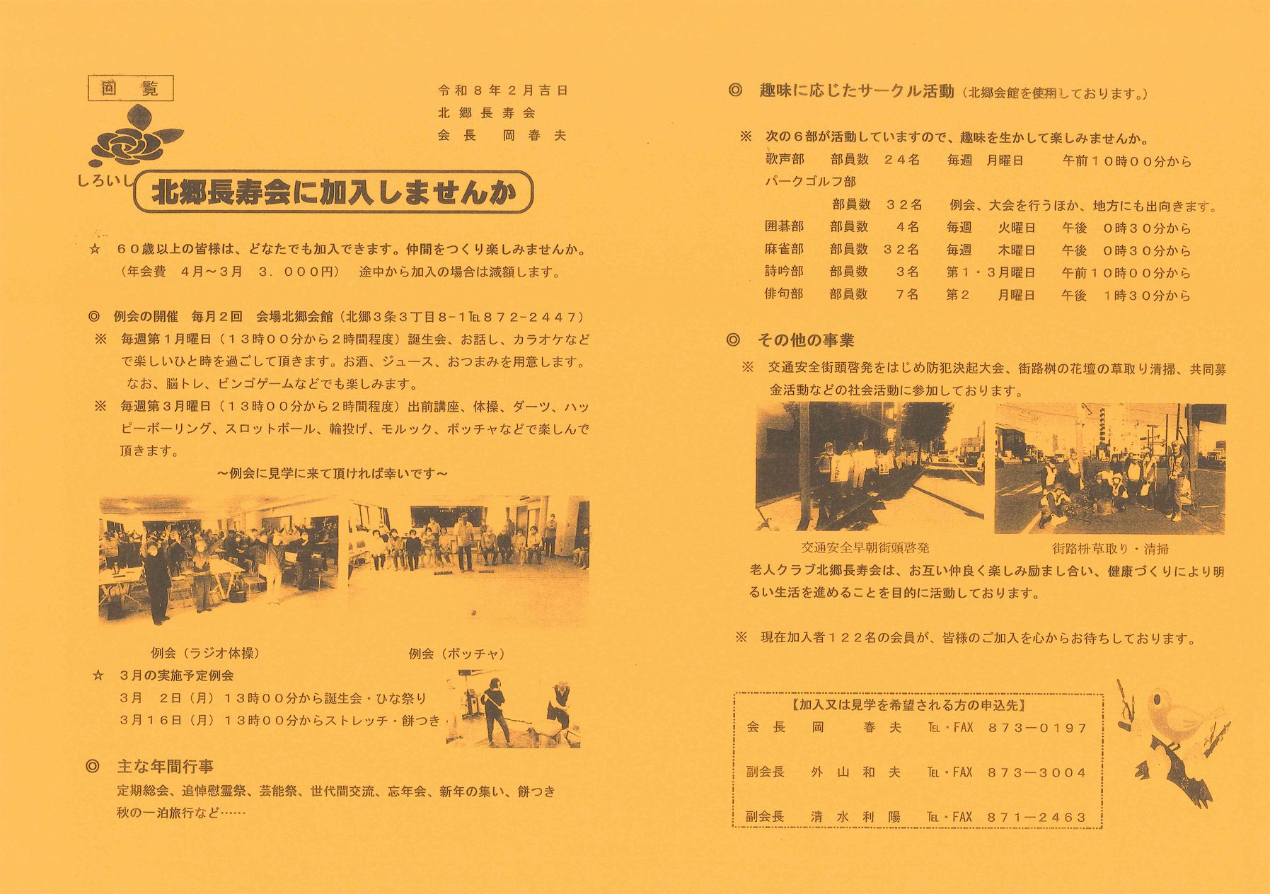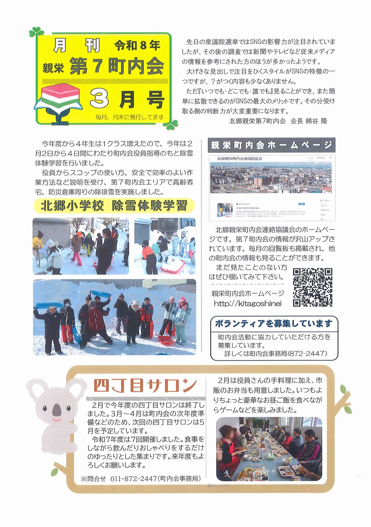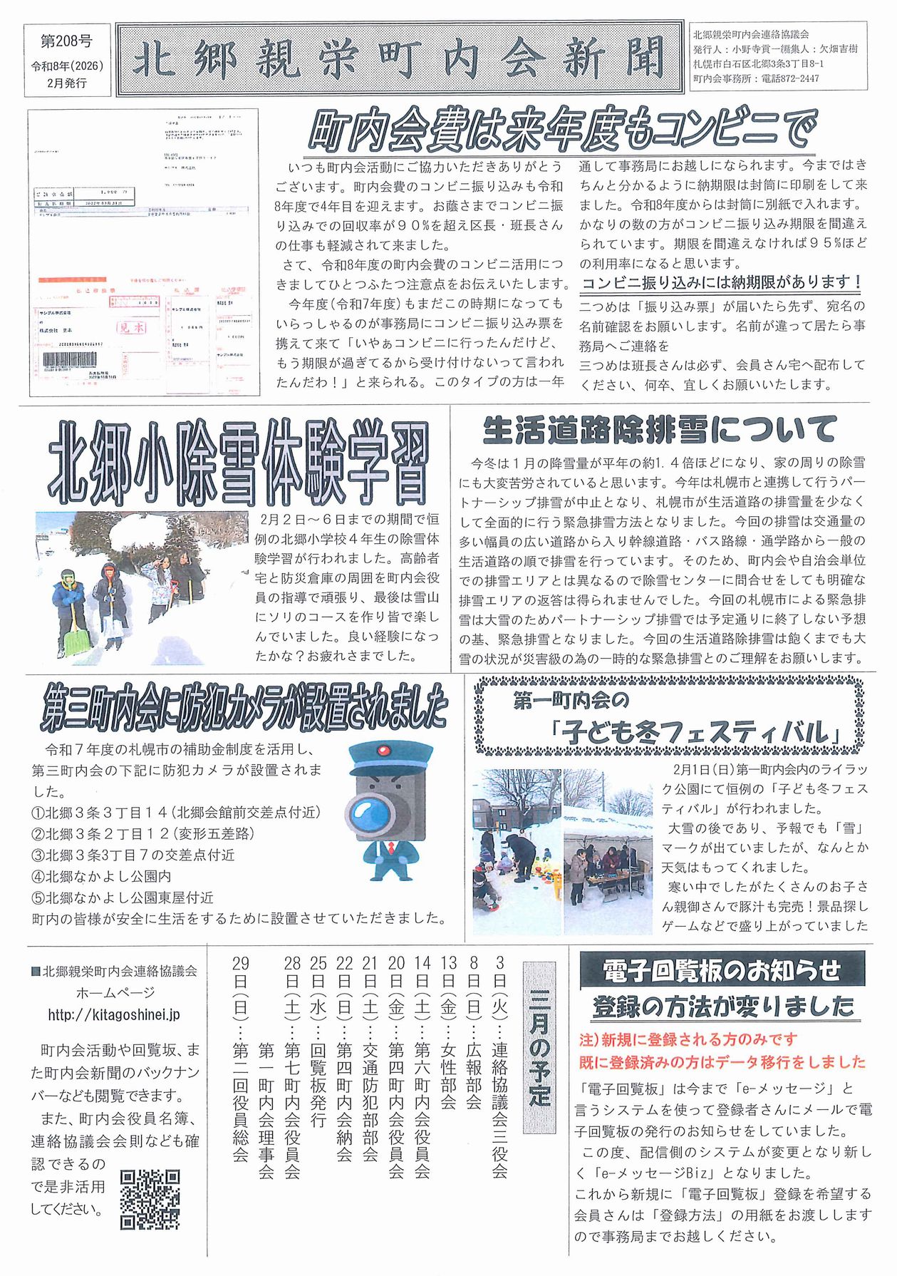 2026年2月25日 / 最終更新日 : 2026年2月25日 shinei-jimu 回覧板 2月末発行電子回覧板 〇北郷親栄町内会新聞 表面〇町内会新聞 裏面〇第六町内会だより〇月刊第七町内会〇北郷小学校「資源回収のお願い」〇北郷交番より「北都」〇菊水元町地区センターおたより〇北白石地区センター広報〇白石区体育館 「春のスポーツ教室受講者募集」〇北海道歴史文化財団「北海道開拓の村ボランティア募集」〇北郷長寿会に加入しませんか 共有:クリックして Twitter で共有 (新しいウィンドウで開きます)Facebook で共有するにはクリックしてください (新しいウィンドウで開きます) 関連 FacebooktwitterHatenaPocket